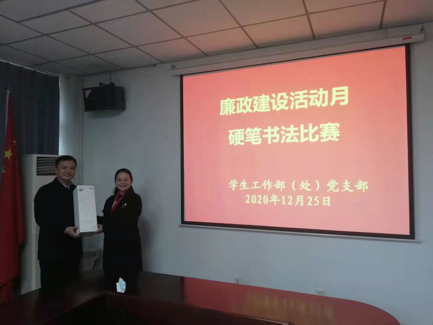 为进一步深入学习贯彻党的十九届四中、五中全会精神及十九届中央纪委四次全会、十届省纪委五次全会精神和全省教育系统全面从严治党工作会议精神,2020年12月25日下午,学生工作部(处)以“学法守纪·廉洁敬业”为主题,开展廉政硬笔书法比赛。比赛邀请潘春彩副院长与全体教职工共同参与。