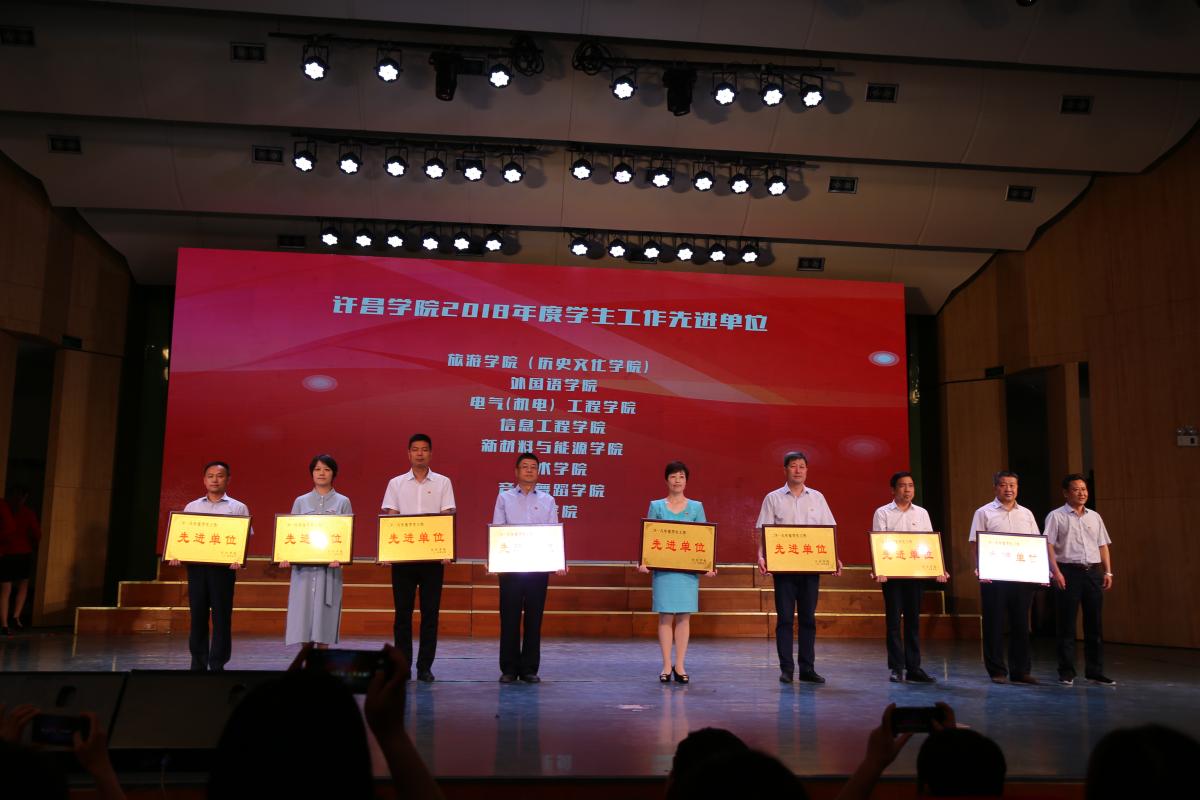 颁奖典礼上,校党委副书记孙海、副校长郭涛、工会主席高金星和相关职能部门负责人分别为2018年度学生工作先进单位、考研工作先进单位、优秀辅导员、最美大学生、先进班集体、三好学生标兵、三好学生、优秀学生干部、国家奖学金、国家励志奖学金和许昌学院奖学金等获奖集体和个人颁发奖牌、奖杯和荣誉证书。
