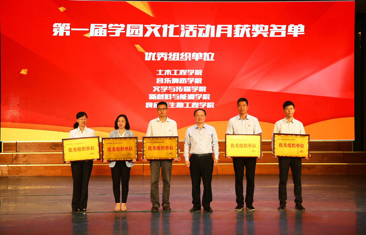 后勤管理服务中心主任刘军伟宣读了第一届学园文化活动月表彰决定。土木工程学院、文学与传媒学院、新材料与能源学院、食品与生物工程学院、音乐舞蹈学院获得优秀组织奖,与会领导为在学园文化活动月系列活动中表现突出的先进集体和个人颁发了奖牌及荣誉证书并表示祝贺。
