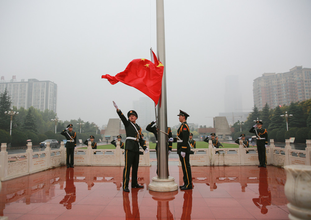 早上6时40分,冒着淅沥的秋雨,我校13名国旗护卫队队员迈着整齐的步伐,庄严走向升旗台。伴随着庄严的《义勇军进行曲》,鲜艳的五星红旗在晨风中冉冉升起。在场的全体师生庄严肃立,行注目礼。我校文学与传媒学院2018级新生代表王佳龙在国旗下发言。在发言中,他带领大家回顾了中华英雄儿女永不屈服,以自身血肉换回抗战胜利的英勇历史,并号召和平时代的青年学子铭记历史,勿忘国耻,不负重托,执笔为剑,墨洒成军。他的发言引起了在场师生的强烈共鸣。仪式最后,全体师生高举右手,不惧风雨,面向国旗,庄严宣誓:“勿忘国殇,吾辈自强;扬荣拒耻,成贤成长;人民为先,祖国至上;振兴中华,再筑辉煌。”
