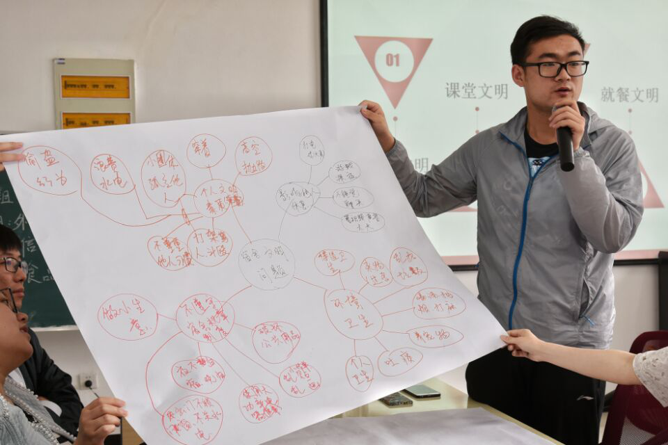 本期辅导员工作坊以“如何加强我校基础文明建设”为活动主题,通过主旨发言、分组互动、总结分享四个环节展开。首先,由文学与传媒学院团总支副书记訾冉根据文学与传媒学院基础文明建设开展情况做主旨发言,分别从工作的目标与思路、实施方法与过程、工作成效与经验三个方面与所有辅导员进行了经验分享和交流。第二环节,李立夏书记以头脑风暴的方式,引导四个辅导员小组活动分别以“宿舍文明”、“课堂文明”、“校园文明”、“就餐文明”展开分组讨论,找出存在的问题并且提出对策方法。第三环节,各小组分别根据实际工作需求去粗取精,进行总结陈述并和其他小组进行了交流互动。