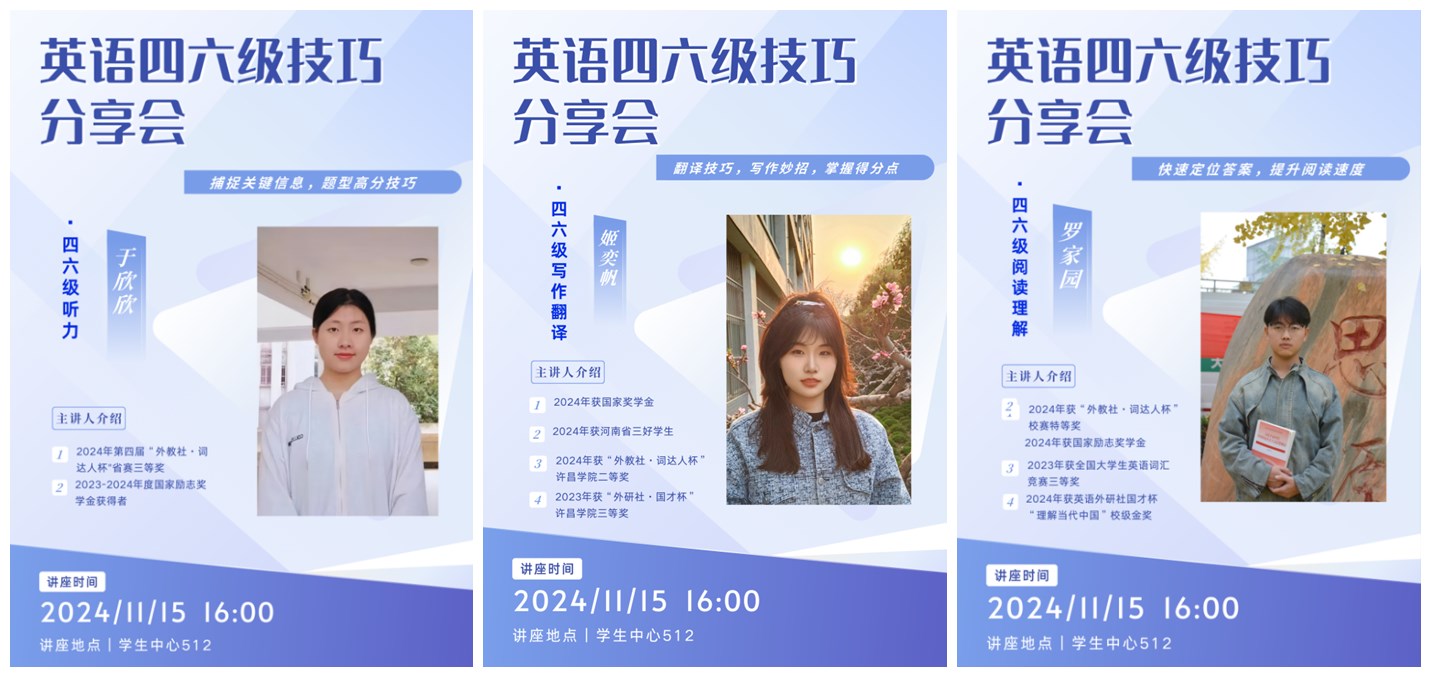 11月4日晚上,以“突破读写听,备战四六级”为主题的知识讲座在学生中心举行,学霸者联盟考证指导组三名四六级考试成绩优异的学生代表针对题型重点难点分享了学习方法与做题技巧。随后组织了四六级模拟赛事,多方面检验参与学生的英语应用能力。线上学习打卡活动包含单词打卡、长难句阅读打卡、听写译打卡三类,共计参与人数六百余人,旨在以线上打卡的形式相互鼓励、相互监督,强化自律,共同进步。