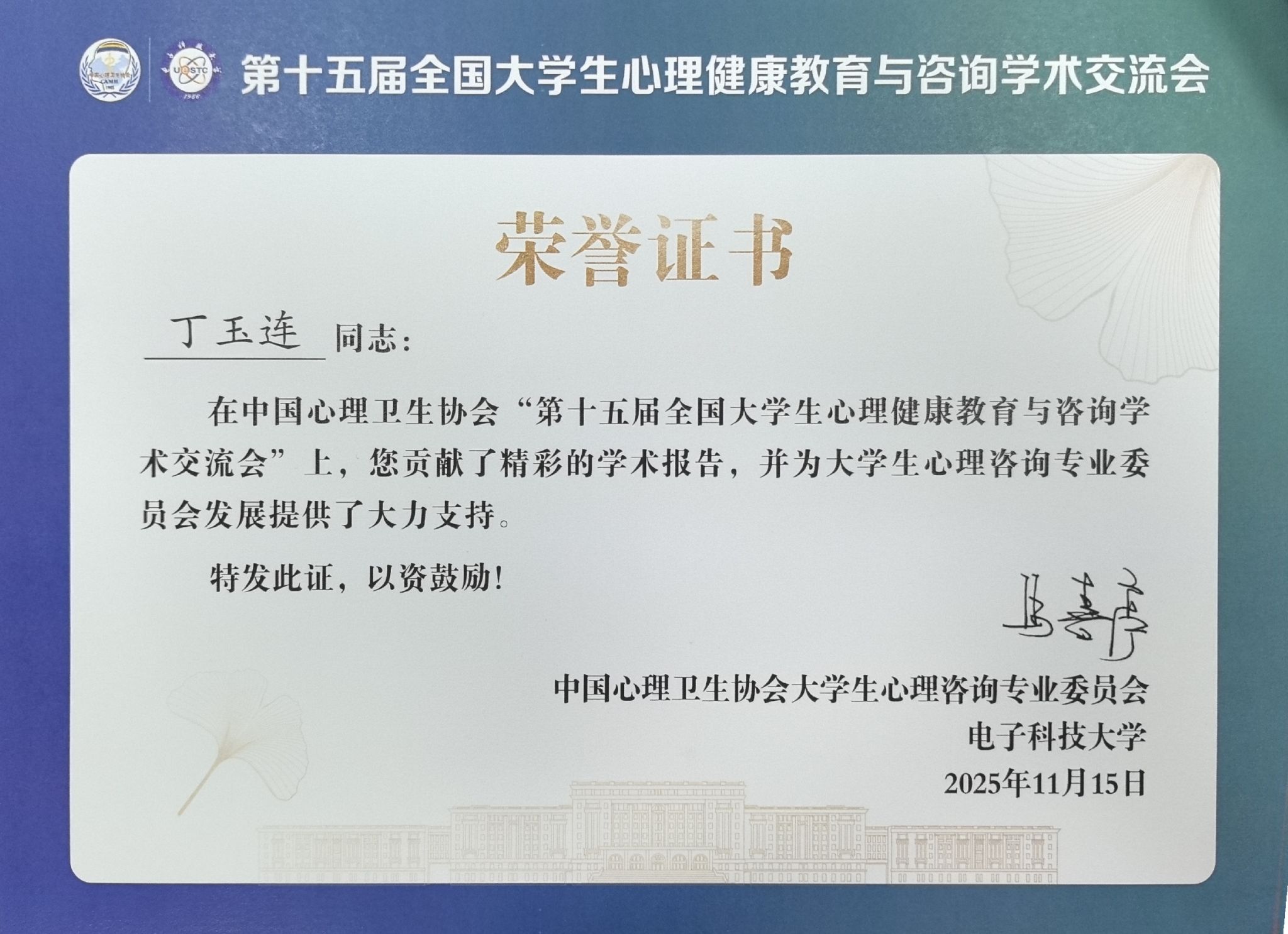 11月13日至15日,由中国心理卫生协会大学生心理咨询专业委员会主办、电子科技大学承办的第十五届全国大学生心理健康教育与咨询学术交流会在清水河校区召开。会议以“数智赋能-高校心理健康教育高质量发展新路径”为主题,来自全国各高校专职心理健康教师、辅导员七百余人参会。我校选派丁玉连和孙静如两位教师参会。