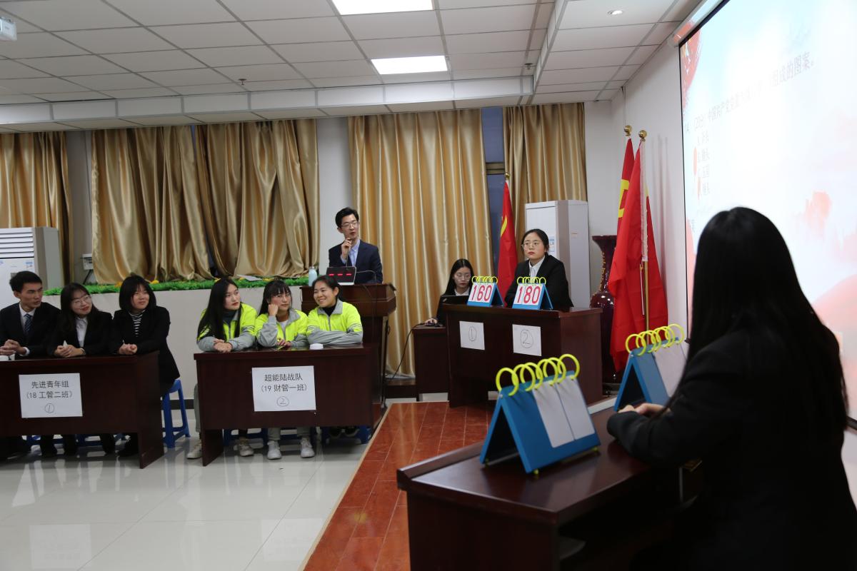 本次比赛由商学院团总支学生会组织部副部徐钰博主持,主持人简单介绍比赛规则后比赛正式拉开帷幕。4支参赛队伍队同台竞技,以个人必答题、抢答题、选择答题、PK、风险题5个环节开展,按队伍积分进行最终排名。比赛现场如火如荼,各小组竞争激烈,小组成员在小组长的带领下踊跃发言积极回答问题。在主持人发出“请抢答”指令后,各小组你争我抢,快速地按下抢答器,并在听到“请回答”声音后准确无误地报出答案。比赛现场充斥着激烈的氛围,各参赛队精神高度集中,丝毫不松弛;观众紧盯场上比赛进程,不错过任何一个精彩瞬间。经过一番激烈角逐,最终18会计二班“三人行我必行队”获第一名,,19财管一班“超能陆战队”获第二名,18工管二班“先进青年组”获第三名,19财管二班“社会主义接班人”获第四名。党总支副书记海泳为四支队伍分别颁发奖品与证书,同时肯定了他们在赛场上的精彩表现,对他们获此奖项表示祝贺。