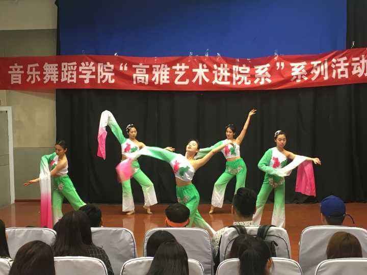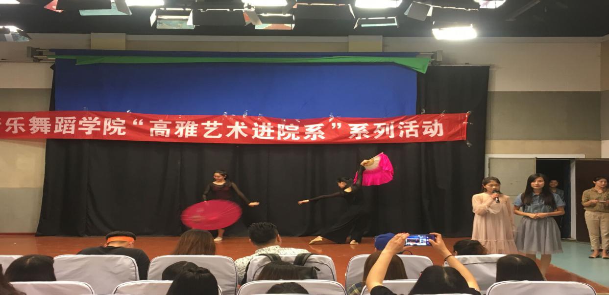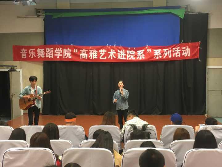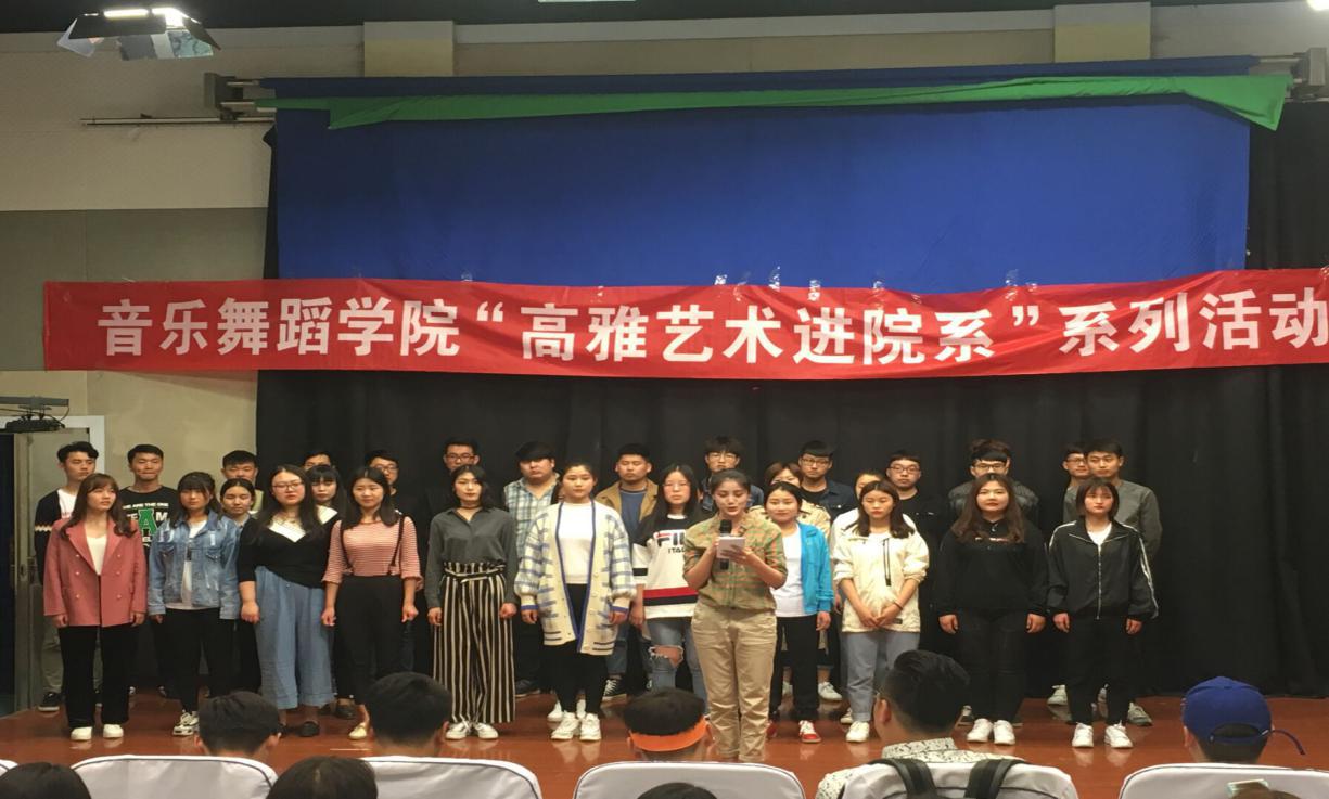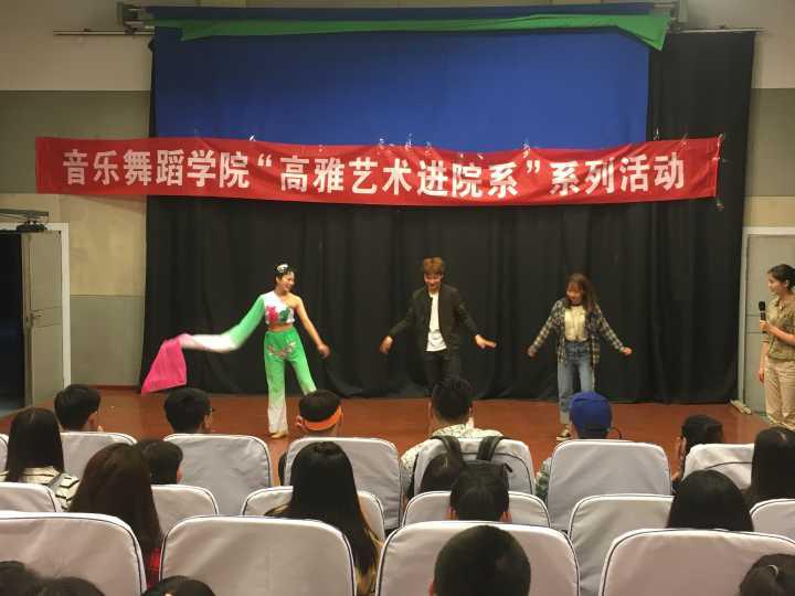 4月1日下午音乐舞蹈学院在文学与传媒学院举办了高雅艺术进院系活动,节目内容丰富多彩。有合唱表演,萨克斯演奏,古典舞,吉他弹唱。让文传院的学子们体验到了艺术的魅力。我院学生精心编排的节目赢得了文传院热烈的掌声。在节目表演期间也穿插了两院互动的环节,并给文传院学子讲述了演奏乐器及舞蹈的基本知识。