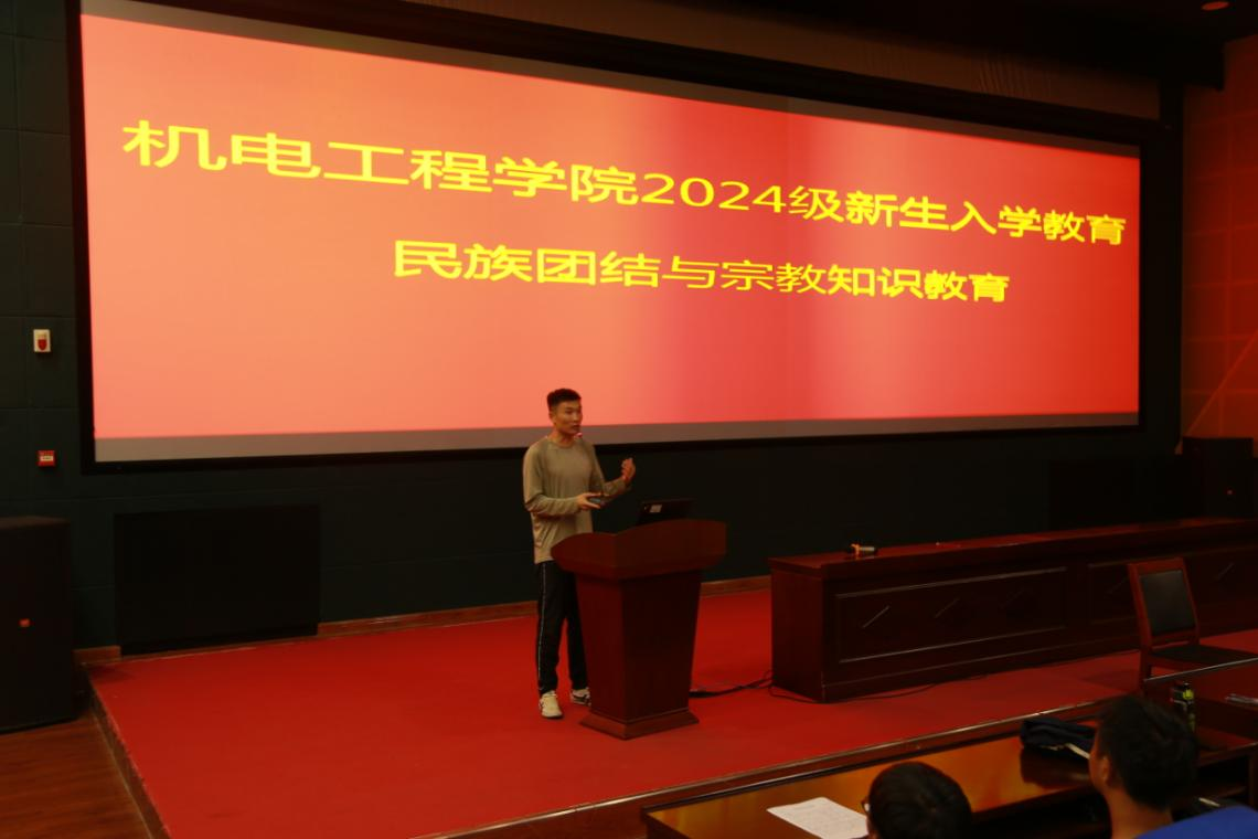 9月24日晚,在学生中心二楼多功能报告厅,机电工程学院团委副书记孙鹏为2024级新生进行民族团结与宗教知识教育专题讲座。孙老师深入浅出地讲解了我国的宗教政策法规,强调了大学生应树立正确的宗教观。同学们认真聆听,积极互动,对宗教政策有了更深刻的理解。此次讲座为同学们正确认识宗教、遵守宗教政策奠定了坚实基础,有助于营造和谐稳定的校园环境。