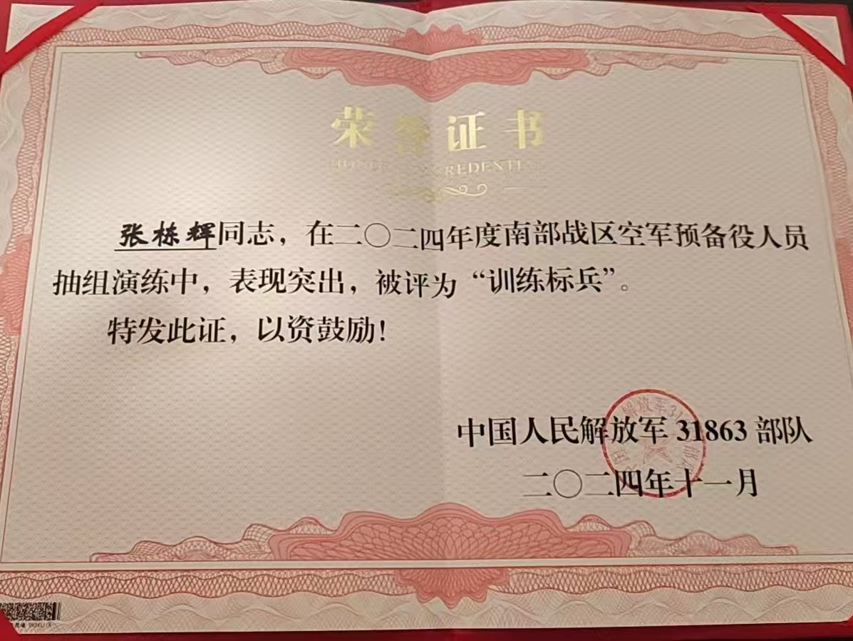 近日,中国人民解放军31863部队致函我校,积极肯定了商学院张栋辉同学响应召集、于11月圆满完成南部战区空军预备役人员抽组演练任务,获评“训练标兵”,并对学校大力支持国防事业表示感谢。