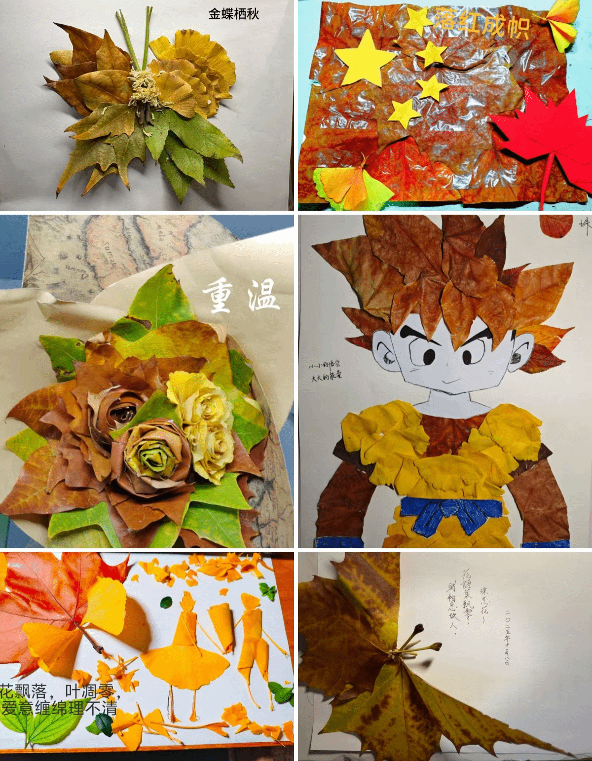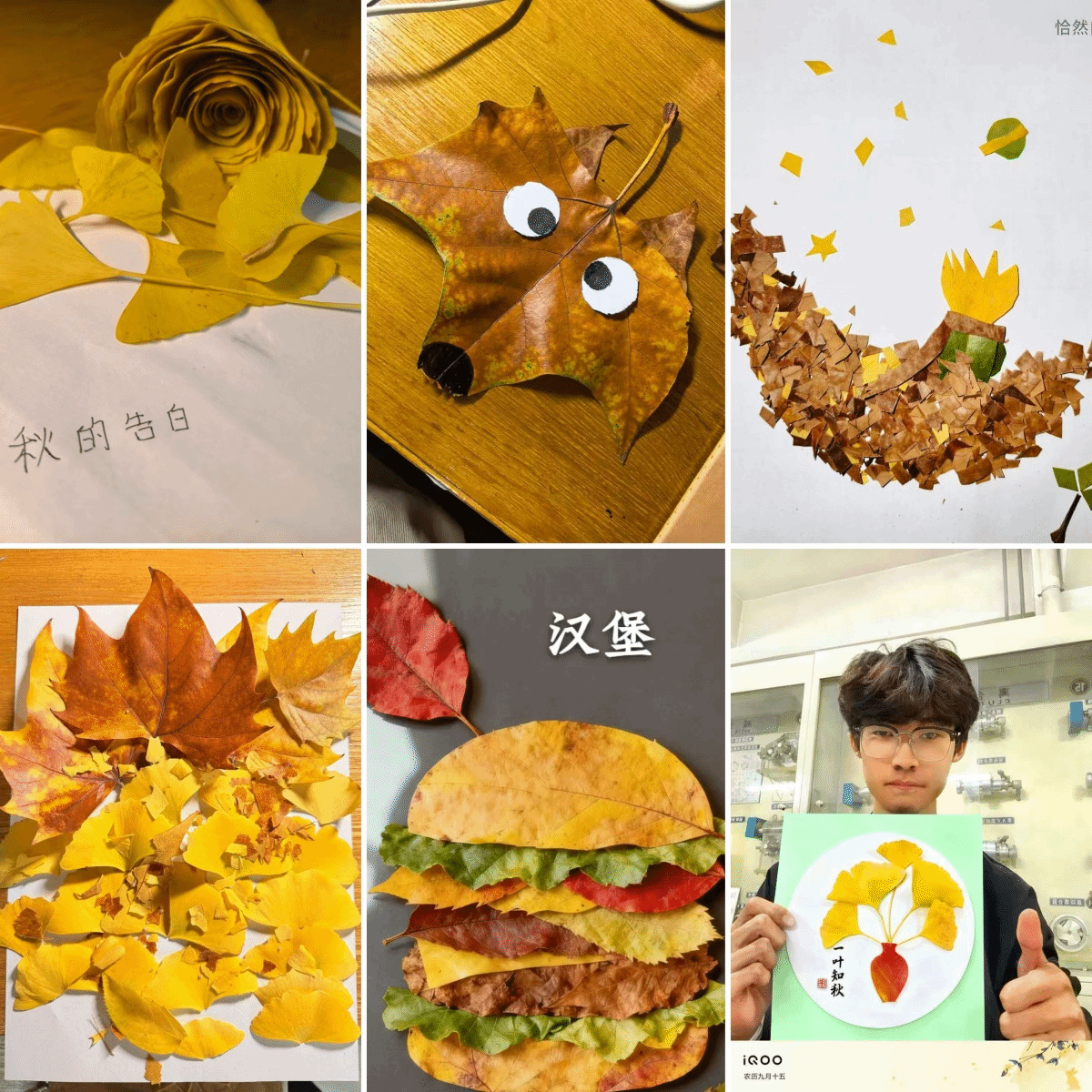 创作环节中,同学们的巧思让秋叶绽放出多元魅力:有人以银杏叶层叠成浪漫的“秋的告白”玫瑰,用金黄脉络织就温柔意象;有人将梧桐叶拼贴成灵动的小动物、唯美的风景图,再现校园秋景的生机与浪漫;还有人以叶为料堆叠出逼真的“汉堡”,或是用碎叶铺成皇冠、以叶片模拟“一叶知秋”的树影,从浪漫装饰到趣味形象,每一件作品都藏着对秋日的独特感知。创作间,大家分享着叶片挑选的心得、拼接的技巧,笑声裹着秋意,让学业的疲惫在指尖的创意里悄然舒展。