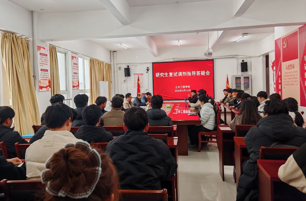 为做好2026届考研毕业生复试与调剂指导服务工作,切实为考研学生排忧解难,3月16日下午,土木工程学院在学院503会议室召开考研复试调剂指导答疑会。学院副院长尚世宇、导师代表徐可、徐阳晨、张飞,毕业年级辅导员任衍枭及2026届考研毕业生参加会议,会议由党委副书记张忠强主持。